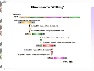 Chromosome walking is a technique used to analyze large regions of DNA by identifying overlapping clones. It involves selecting a starting clone, subcloning fragments from the ends, and using those fragments to screen a genomic library and identify neighboring clones with overlapping sequences. This process is repeated to "walk" along the chromosome. Chromosome walking was developed in the 1980s and is useful for finding mutations associated with genetic diseases and detecting single nucleotide polymorphisms, though it has limitations with repetitive sequences.