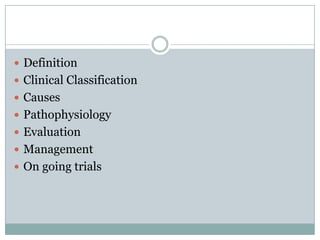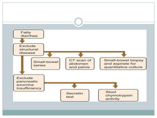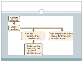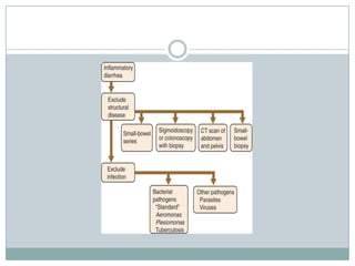 This document discusses chronic diarrhea, defining it as diarrhea lasting more than 4 weeks. It classifies chronic diarrhea based on factors such as duration, volume, pathophysiology, and stool characteristics. Common causes include infections, inflammatory bowel disease, irritable bowel syndrome, malabsorption issues, and medication side effects. A thorough history, physical exam, and laboratory testing can help identify the underlying cause and guide management, which may include dietary changes, medications, or further testing and procedures.