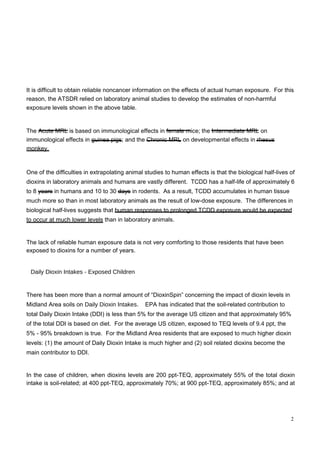 The document discusses chronic dioxin exposure and its effects. It notes that chronic exposure is correlated with increased cancer mortality and discusses challenges in studying non-cancer effects. It also provides estimates from health organizations on acceptable daily intakes of dioxins and compares potential daily intakes for children in different areas based on soil and dietary exposure levels. Nursing infants are estimated to have much higher potential daily intakes from breast milk compared to children or adults.