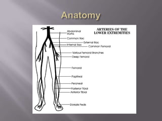 1. The document discusses peripheral arterial occlusive disease (PAOD), also known as peripheral artery disease (PAD), which refers to obstruction of arteries outside the heart and brain.