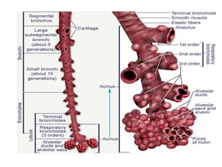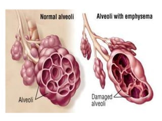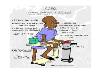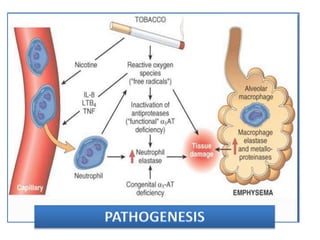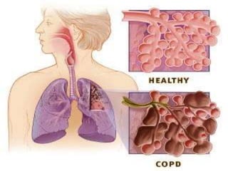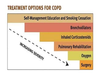 This document defines COPD and provides details about its symptoms, causes, diagnosis, and treatment. COPD is a progressive lung disease characterized by difficulty breathing caused by damage to the lungs. The most important risk factor is cigarette smoking. Symptoms include a chronic cough, sputum production, and shortness of breath. Diagnosis involves pulmonary function tests showing obstruction and reduced airflow. Treatment focuses on smoking cessation and includes bronchodilators, steroids, oxygen therapy, antibiotics for exacerbations, and surgery in severe cases.