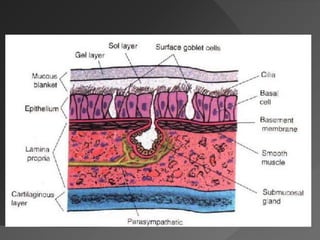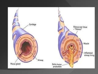 The document discusses various respiratory disorders, focusing on chronic obstructive pulmonary disease (COPD), chronic bronchitis, emphysema, asthma, bronchiectasis, and cystic fibrosis. It outlines the classification, causes, clinical features, and management of these conditions, highlighting their impact on airflow and lung function. Key treatment strategies include bronchodilators, steroids, physiotherapy, and methods to clear secretions.