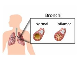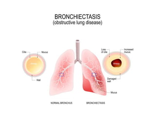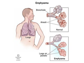 The document provides an overview of Chronic Obstructive Pulmonary Disease (COPD), detailing its definition, etiology, pathophysiology, and clinical presentations including emphysema, chronic bronchitis, and bronchiectasis. It outlines common symptoms, risk factors, and diagnostic investigations, as well as management strategies for controlling the disease. It emphasizes the lack of a cure but highlights the importance of treatment options such as smoking cessation, medications, and pulmonary rehabilitation.