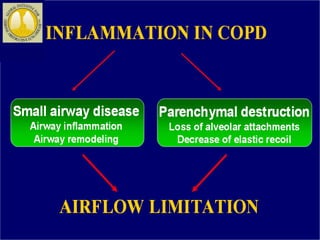 COPD is characterized by airflow limitation caused by chronic inflammation in the lungs in response to noxious particles. The document discusses the pathogenesis and pathology of COPD, including oxidative stress and protease-antiprotease imbalance leading to lung destruction and inflammation. Cigarette smoke and other irritants are major risk factors that induce inflammation through recruitment of cells like macrophages and neutrophils. This causes emphysema of the lung parenchyma and obstruction of small airways.