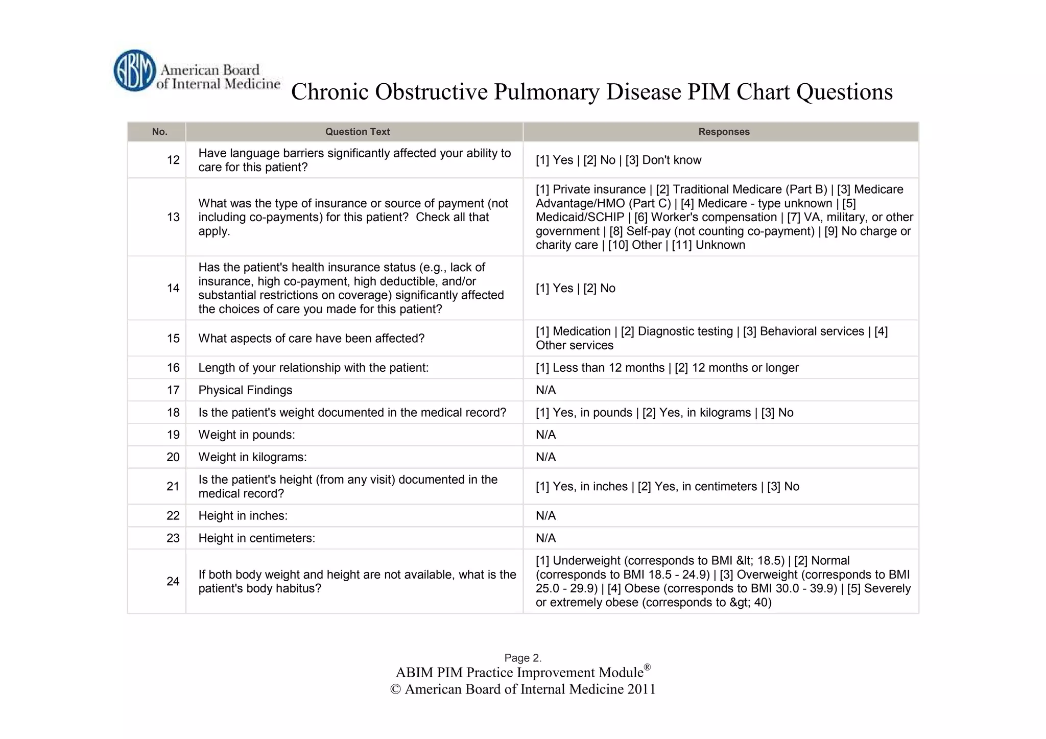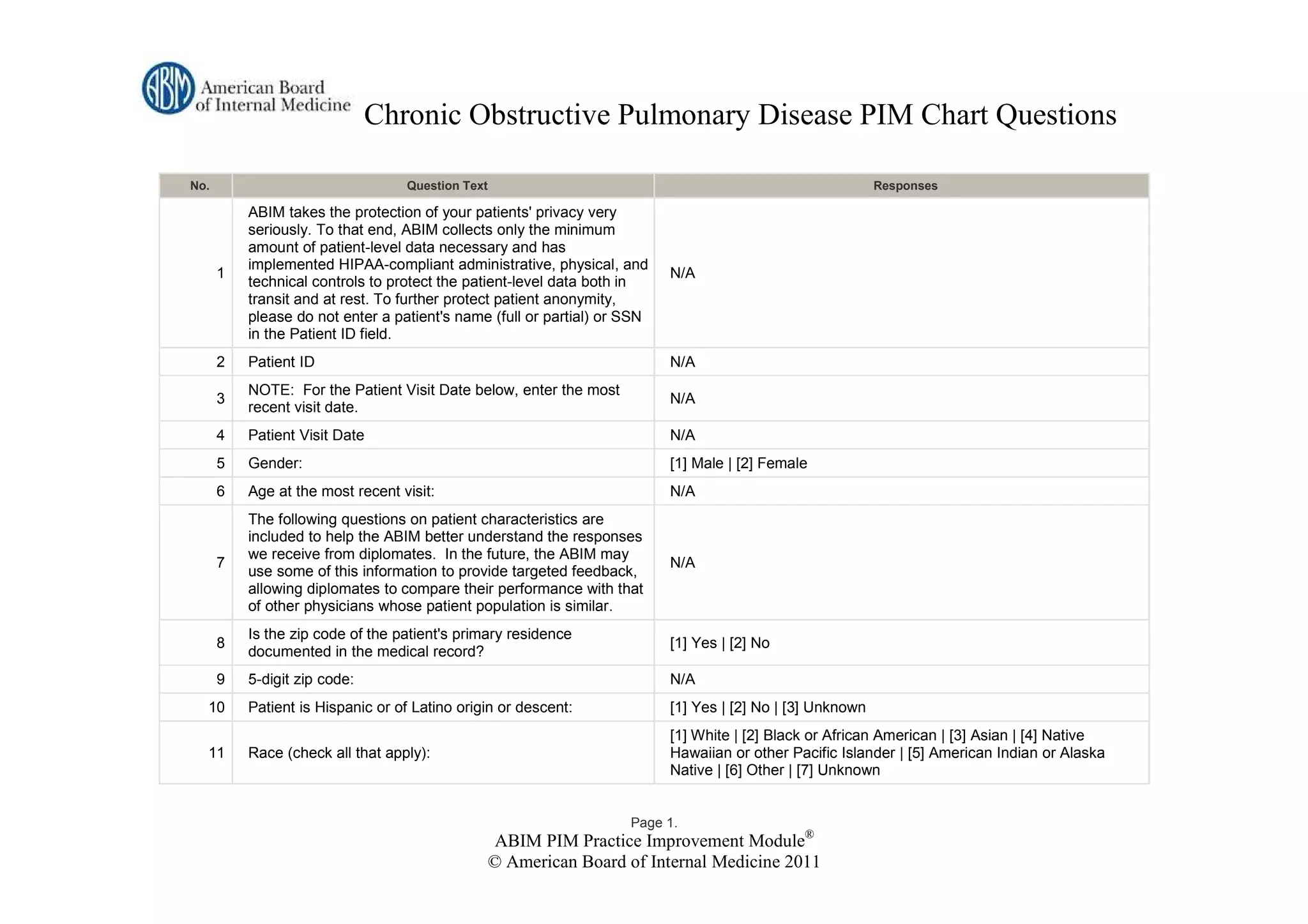 The document outlines a set of questions and responses for assessing chronic obstructive pulmonary disease (COPD) care practices while ensuring patient privacy through HIPAA compliance. It includes inquiries about patient characteristics, health insurance status, smoking cessation support, and treatment interventions, as well as documentation of relevant medical measurements. This information is intended to assist the American Board of Internal Medicine (ABIM) in collecting data to provide targeted feedback to healthcare providers.
