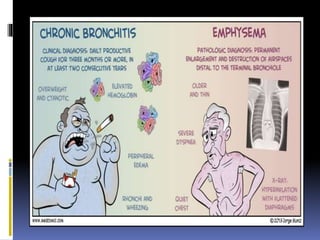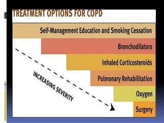 This document provides information about Chronic Obstructive Pulmonary Disease (COPD). It defines COPD as a progressive lung disease that makes breathing difficult. The two main conditions that make up COPD are chronic bronchitis and emphysema. Risk factors include cigarette smoking, air pollution, and genetic conditions. Symptoms vary between chronic bronchitis and emphysema. Management involves smoking cessation, medications like bronchodilators and steroids, oxygen therapy, and sometimes surgery. The severity of COPD is classified by lung function testing into four stages from mild to very severe.