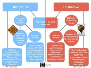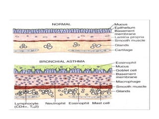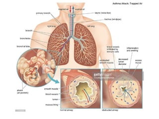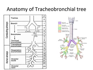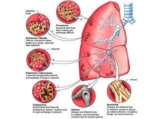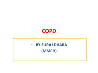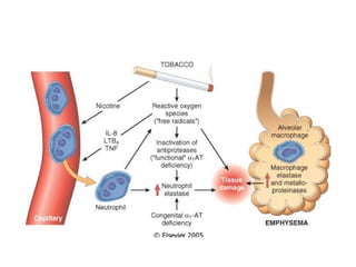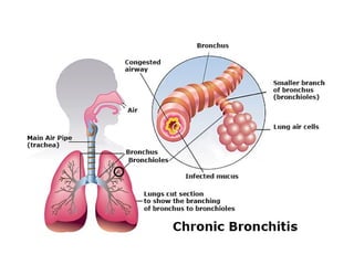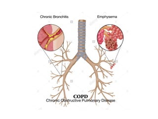 The document outlines chronic obstructive pulmonary diseases (COPD), focusing on chronic bronchitis, emphysema, and bronchiectasis, highlighting the pathogenesis, clinical features, and complications associated with each. It details the mechanisms of airflow obstruction, inflammation, and the impact of factors like smoking and genetic conditions such as alpha-1 antitrypsin deficiency. Additionally, it discusses the morphological and histological characteristics of these diseases as well as their clinical manifestations and treatment considerations.
