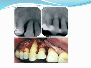 Chronic periodontitis is an inflammatory disease that causes the destruction of tissues that support the teeth. It is caused by an accumulation of plaque and calculus on the teeth over time. It is characterized by pocket formation, attachment loss, and bone loss. Risk factors include smoking, diabetes, and certain bacteria. The disease progresses slowly through periods of destruction and remission. Treatment involves plaque control, scaling and root planing to reduce bacteria and inflammation.