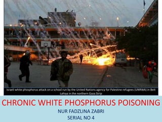 Chronic white phosphorus poisoning can occur through burning, inhalation, or ingestion of white phosphorus. Inhalation over long periods can lead to osteonecrosis of the jaw, known as "Phossy Jaw", characterized by toothache, gum swelling, and bone necrosis of the lower jaw. Burning from white phosphorus causes severe second and third degree burns that continue burning until deprived of oxygen. Ingestion is also highly toxic and can cause liver, heart, or kidney damage due to accumulation of free radicals in the body. White phosphorus is highly flammable and produces a dense white smoke when burned.