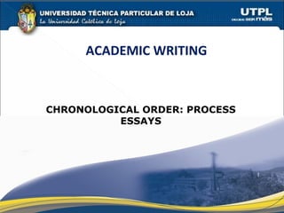 Chronological order is used to organize process essays by discussing the steps of a process in the order they occur. A thesis statement for a process essay indicates the time order of the process and may name the steps. Transition signals are used to show the sequence of steps. The document provides an example outline of a process essay on digestion, with the introduction stating the three major steps of ingestion, digestion, and absorption, and each body paragraph explaining one of the steps in time order.