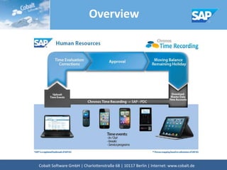 The document provides an overview of Cobalt Software GmbH's time recording solutions, which include the Chronos Terminal Server and Chronos Data Connector. These modules facilitate the integration of time recording terminals with SAP systems through TCP/IP communication, XML data packets, and various recording methods such as terminals, browsers, and mobile devices. Additionally, the software supports the downloading and uploading of employee, project, and cost center data to and from SAP.