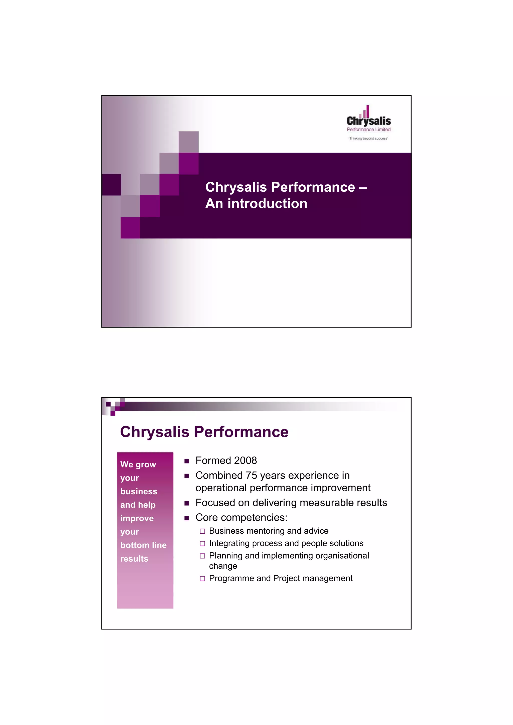 Chrysalis Performance is a company formed in 2008 with a combined 75 years of experience in operational performance improvement. They focus on delivering measurable business results for their clients through core competencies like business mentoring, integrating process and people solutions, and planning and implementing organizational change. Their areas of expertise include strategic and operational coaching, organizational change, continuous improvement, sales and marketing support, credit management, procurement and supplies, and service quality assessment. Their goal is to be recognized for delivering measurable results to satisfy themselves and their clients that they are providing value.