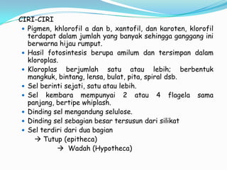 Chrysophyta, atau ganggang keemasan, merupakan kelas ganggang yang berwarna keemasan dan memiliki kloroplas dengan pigmen karoten serta xantofil, berfungsi sebagai produsen fotoautotrof. Diatom, yang merupakan bagian dari kelas ini, adalah tumbuhan uniseluler dengan banyak spesies yang terikat pada substrat serta berperan penting dalam ekosistem laut sebagai produsen primer. Reproduksi diatom dapat berlangsung secara vegetatif atau generatif, dan mereka memiliki ragam bentuk hidup yang beradaptasi dengan berbagai lingkungan.