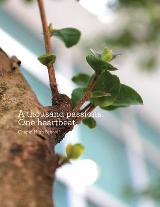 This document provides information about Chapin High School and its approach to educating the whole child. It discusses the school's various academic programs and concentrations that allow students to pursue their passions, including visual arts, performing arts, engineering, medicine, and more. It also highlights Chapin's strong standardized test scores and graduation rates as well as the school's emphasis on extracurricular activities and developing well-rounded students.