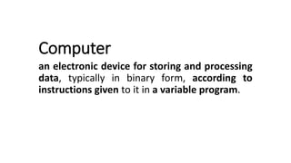 The document discusses the different components that make up a computer system. It begins by defining a computer as an electronic device that can store and process data according to programmed instructions. It then describes the main components of a computer which include hardware, software, and firmware. The document goes into detail about the various hardware components such as the central processing unit, memory, mass storage devices, input devices like keyboards and mice, and output devices like monitors and printers. It also discusses different types of software and input/output peripherals.