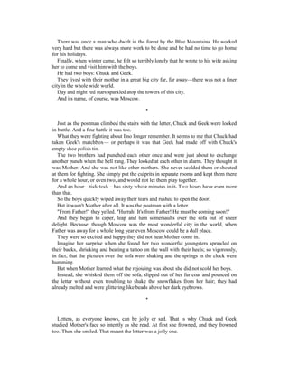 This document provides a summary of the beginning of the story "Chuck and Geek" by Arkady Gaidar. It introduces the two main characters, Chuck and Geek, who are brothers living in Moscow with their mother. They receive a letter from their father, who lives far away in the forest by the Blue Mountains, inviting them to visit him. Their mother buys train tickets and they embark on the long journey. However, Chuck and Geek get into an argument that causes trouble for their travel plans.