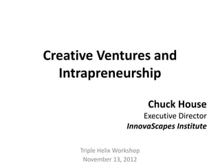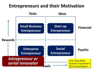 The document discusses different types of entrepreneurs including small business entrepreneurs, social entrepreneurs, enterprise entrepreneurs, start-up entrepreneurs, and intrapreneurs. It notes that intrapreneurs, or entrepreneurs within large corporations, can help drive innovation and renewal even inside big companies. The document also provides examples of how intrapreneurship worked at HP, with 10% of their product lines coming from entrepreneurs but 65% coming from just six intrapreneurs. It concludes by noting that creative ventures come in many forms and that information science can help support transformative contributions across many fields.