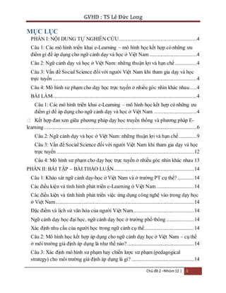 Tài liệu nghiên cứu về e-learning tại Việt Nam, với những mô hình học kết hợp và việc triển khai công nghệ giáo dục. Nó nêu rõ các thuận lợi và hạn chế của ngữ cảnh dạy và học đồng thời đánh giá vai trò của giáo viên cũng như sinh viên trong môi trường học tập trực tuyến. Ngoài ra, tài liệu cũng đề cập đến sự cần thiết của việc kết hợp giữa phương pháp dạy học truyền thống và e-learning để nâng cao hiệu quả đào tạo.