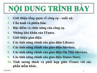 Tài liệu trình bày về phần mềm iTunes của Apple, bao gồm xuất xứ, cấu hình, phiên bản và các chức năng chính như chơi nhạc, đồng bộ hóa dữ liệu với iDevices và hỗ trợ giảng dạy trực tuyến. Nó cũng đề cập đến những khó khăn trong việc sử dụng iTunes và các giao diện người dùng. Cuối cùng, tài liệu nêu rõ tính tương thích của iTunes với các phần mềm khác.