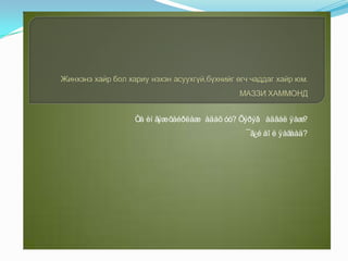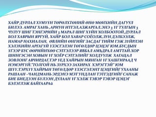 ХАЙР ДУРЛАЛ ХҮМҮҮНТӨРӨЛХТӨНИЙ ӨНӨ МӨНХИЙН ДАГУУЛ БИЛЭЭ. АМРАГ ХАНЬ ,АРИУН ИТГЭЛ,АЗЖАРГАЛ.ЭНЭ 3 ҮГ ТУЛГЫН 3 ЧУЛУУ ШИГ ТЭНГЭРИЙН 3 МАРАЛ ШИГ ХҮЙН ХОЛБООТОЙ.ДУРЛАЛ БОЛ ХАВРЫН ЯРГУЙ, ХАЙР БОЛ ХАВАР СОЁОЛЖ,ЗУН ДЭЛБЭЭЛЖ, НАМАР НАХИАЛАН, ӨВЛИЙН ӨНГИЙГ ЗАСДАГ ТИЙМ ГЭЖ ЗҮЙРЛЭН ХЭЛЭХИЙН АРГАГҮЙ ҮЗЭСГЭЛЭН ТӨГӨЛДӨР ЦЭЦЭГ ЮМ.БУСДЫН ҮГЭЭР БУС ӨӨРИЙНХӨӨ СЭТГЭЛЭЭР ЯВБАЛ АМЬДРАЛ АМТТАЙ.ХОР ШИНГЭСЭН ХОВЫН ҮГ ХОЁР СЭТГЭЛИЙГ ХОЛДУУЛЖ ХАГАЦАЛ ЗОВЛОНГ АВЧИРДАГ.ТЭР ҮЕД ХАЙРЫН МЯНГАН ҮГ ХАШГИРААД Ч НЭМЭРГҮЙ.”ТОЛГОЙ НЬ ЗҮРХЭЭ ЗАХИРАХ ХЭРЭГТЭЙ” ЮМ ШҮҮ.ТЭРХҮҮ ХАЙРЫН ТӨГӨЛДӨР ҮЗЭСГЭЛЭНТ ЦЭЦГИЙГ УХААНЫ РАШААН –ЧАНДМАНЬ ЭРДЭНЭ МЭТ УНДЛАН ТЭТГЭДГИЙГ САНАЖ БИЕ БИЕДЭЭН БҮЛЭЭН ДУЛААН ҮГ ХЭЛЖ ТЭВЭР ТЭВЭР ЦЭЦЭГ БЭЛЭГЛЭЖ БАЙГААРАй - 12.