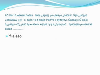 Ì,Õ íàð 10æèëèéíñóðàã÷ àõóé ¿åýñýý ¿é çàéã¿é ¿åðõñýí. Òýä ¿íýõýýð ¿åðõýëäýý ¿íýí÷ ó÷ðààñ 10-ð àíãèàòºãñººä ë ãýðëýñýí. Óäàõã¿é Õ àíõíû õ¿¿õäýýòºð¿¿ëýõãýæáàéíà. Ãýòýë Ì ýíýá¿õýíäÿìàð ÷ áýëòãýëã¿éáàéñíààóõààð÷…………Ýíääàð - 16.