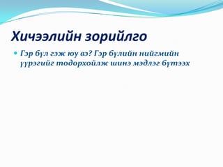 Зорилт К1-ГЭР БҮЛТҮҮНИЙ НИЙГМИЙН ҮҮРГИЙН ТАЛААР ТАНИН МЭДЭХ,К2-ГЭР БҮЛИЙН БҮТЭЦ ТҮҮНИЙ ХЭМЖИГДЭХҮҮНҮҮДИЙГ ХООРОНД НЬ ХАРЬЦУУЛАХ ,ОНЦЛОГИЙГ ТОДОРХ ОЙЛОХ,К3-ГЭР БҮЛ,УДАМ УГСААГАА ЦЭВЭР АРИУН БАЙЛГАХЫГ УХАМСАРЛАХ,К4-ӨНӨӨГИЙ Н ГЭР БҮЛҮҮД НИЙГМИЙН ҮҮРГЭЭ ГҮЙЦЭТГЭЖ ЧАДАЖ БАЙГАА ЭСХЭД ДҮГНЭЛТ ӨГӨХ ГЭР БҮЛИЙН НИЙГМИЙН ҮҮРГИЙГ УХАМСАРЛАХ - 6.
