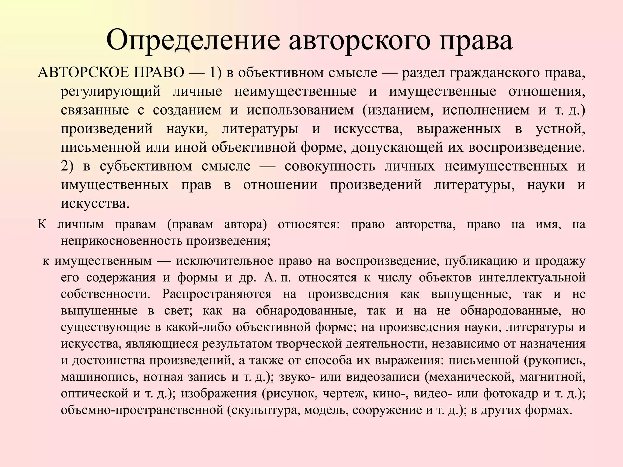 Документ рассматривает авторское право в интернете, определяя его как регулирующее отношения, связанные с созданием и использованием произведений науки, литературы и искусства. Он подчеркивает важность соблюдения прав авторов и необходимость получения разрешений на использование защищенных материалов. Также обсуждаются методы защиты авторских прав, включая использование специальных знаков и лицензий.