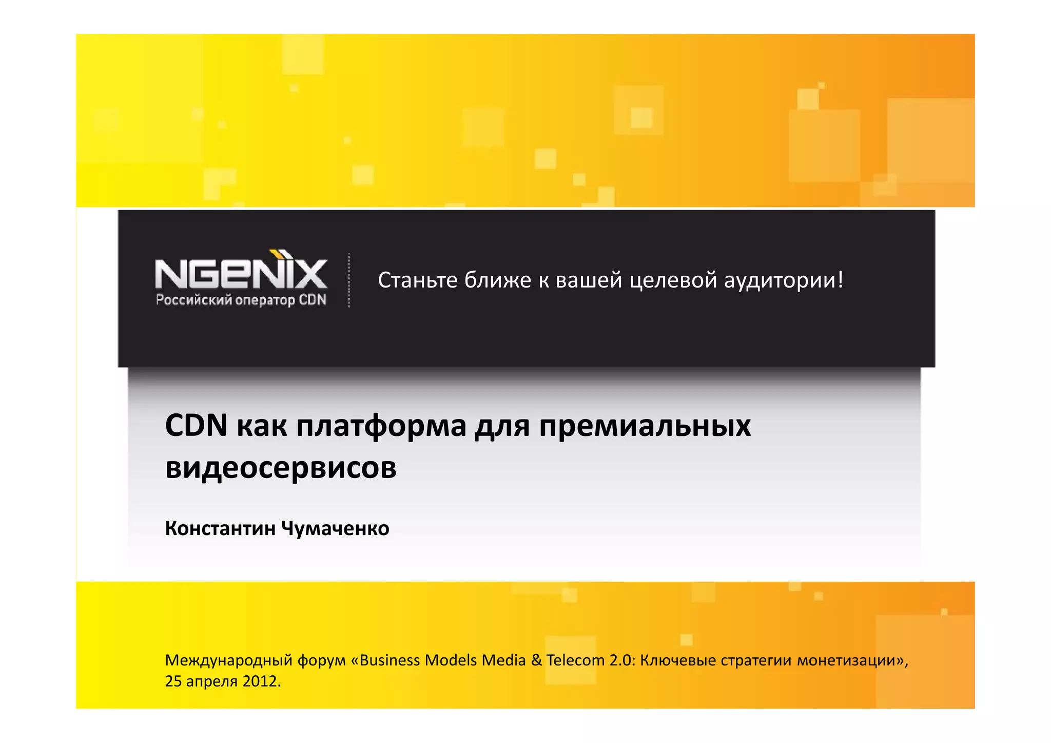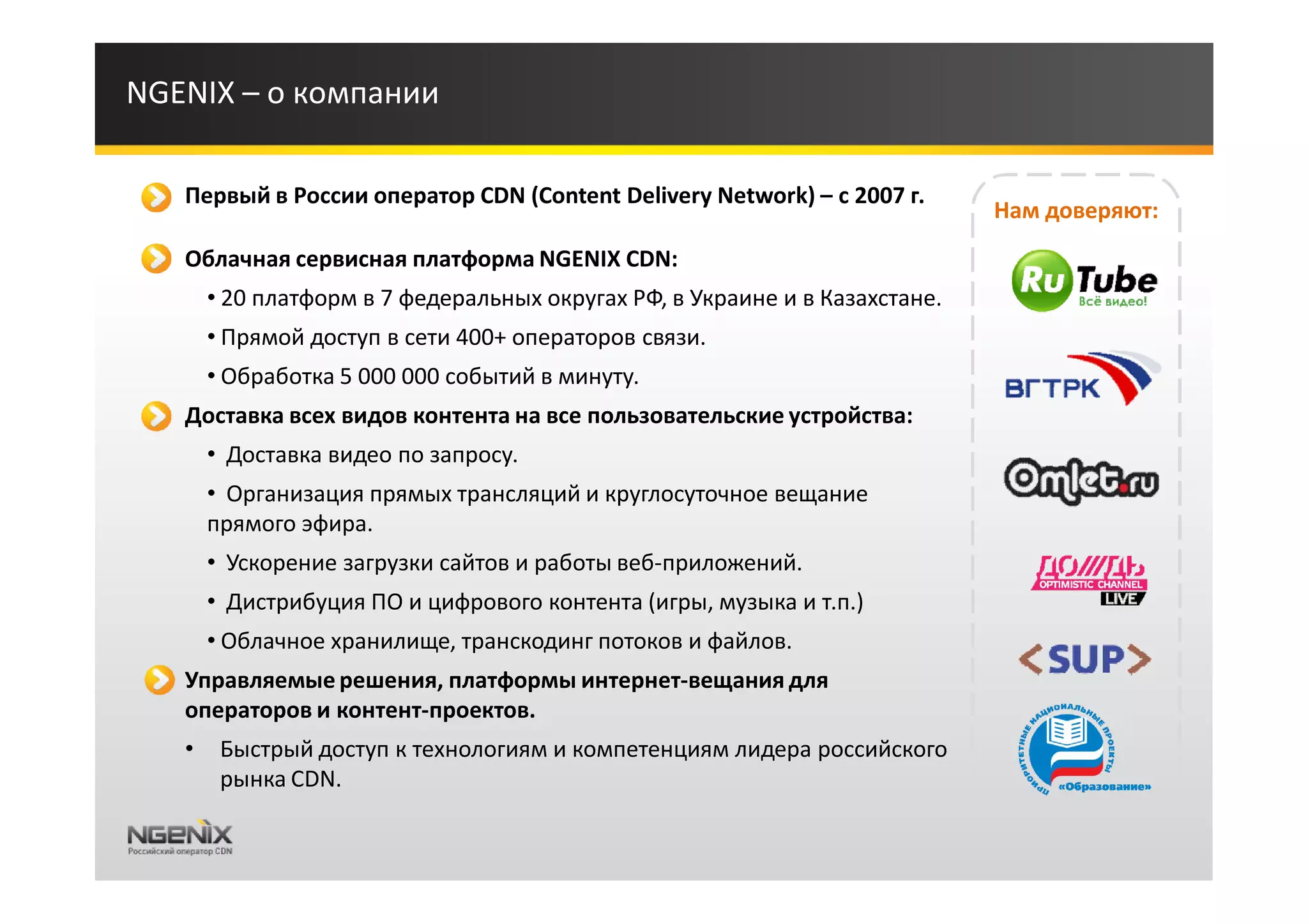 Документ представляет компанию Ngenix, первого в России оператора CDN, и ее услуги по доставке видео и других видов контента. Компания предлагает решение для медиа-сервисов, ускорение загрузки веб-приложений и организует прямые трансляции с высоким качеством. Исследуются тенденции и конкурентная среда на рынке CDN, а также перспективы для операторов связи в области медиа-услуг.