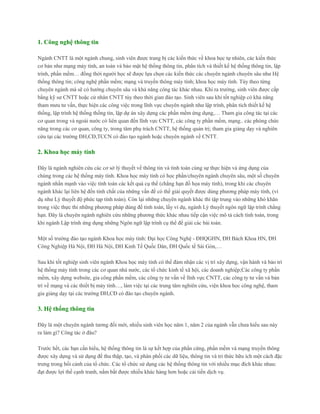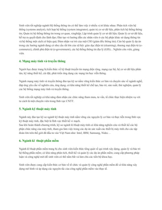 Ngành Công nghệ thông tin cung cấp kiến thức về mạng máy tính, an toàn thông tin và lập trình, cho phép sinh viên chuyên sâu vào hệ thống thông tin, công nghệ phần mềm, máy tính và truyền thông. Sinh viên tốt nghiệp có khả năng tham gia vào nhiều lĩnh vực như tư vấn, phát triển phần mềm, và giảng dạy tại các cơ sở đào tạo. Các ngành chuyên sâu như Khoa học máy tính, Hệ thống thông tin và Kỹ thuật phần mềm đào tạo sinh viên về lý thuyết và thực hành trong công nghệ thông tin.