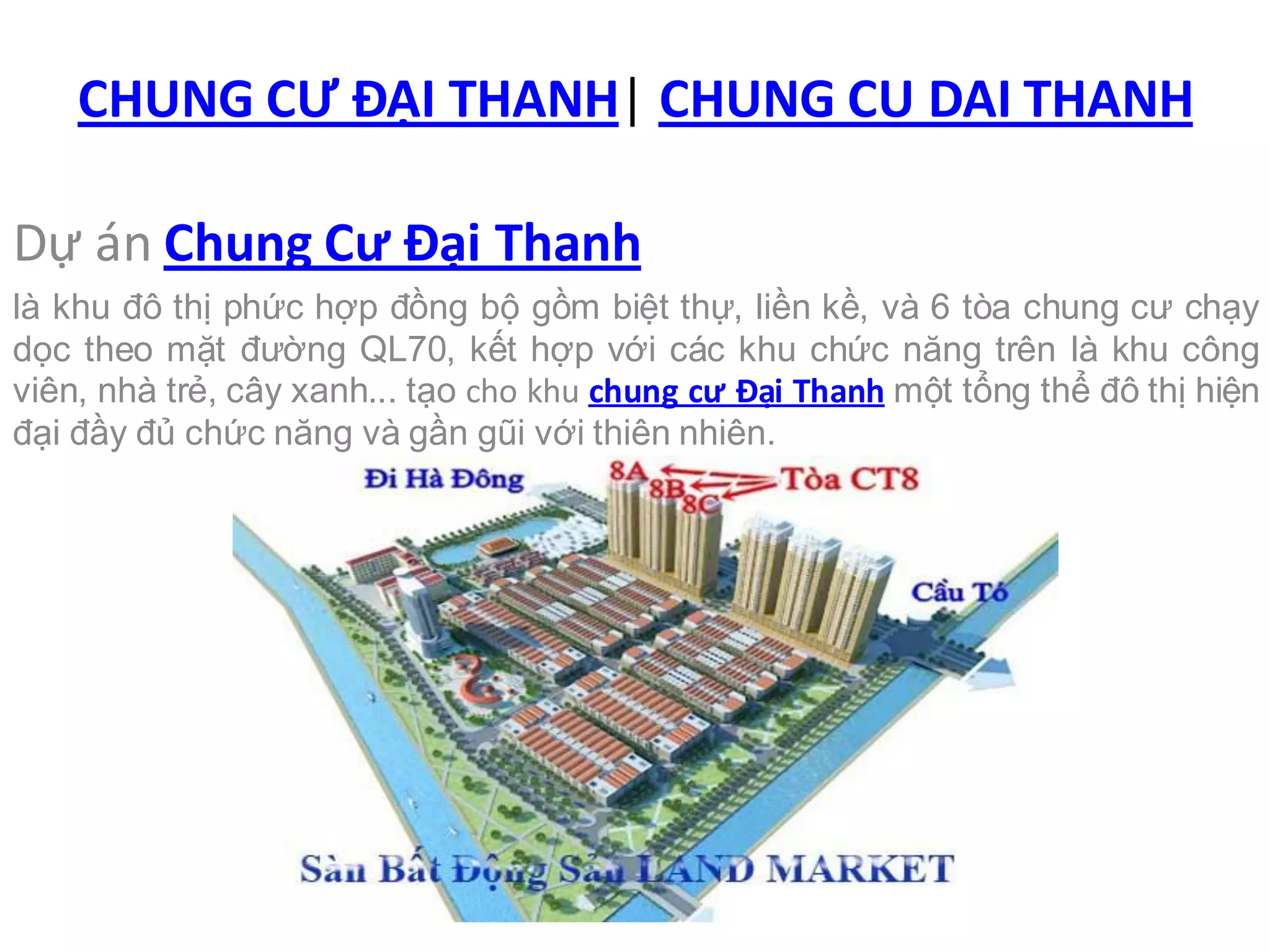 Chung cư Đại Thanh là khu đô thị phức hợp gồm biệt thự, liền kề, và 6 tòa chung cư tại mặt đường QL70, có các tiện ích như công viên và nhà trẻ, hứa hẹn đáp ứng nhu cầu sống hiện đại và gần gũi với thiên nhiên. Dự án có thiết kế linh hoạt với nhiều loại diện tích và giá bán hợp lý cho nhiều đối tượng, đồng thời chủ đầu tư đã có uy tín trên thị trường. Với chính sách thanh toán linh hoạt và hồ sơ pháp lý đầy đủ, khách hàng có cơ hội sở hữu căn hộ mơ ước tại Hà Nội.