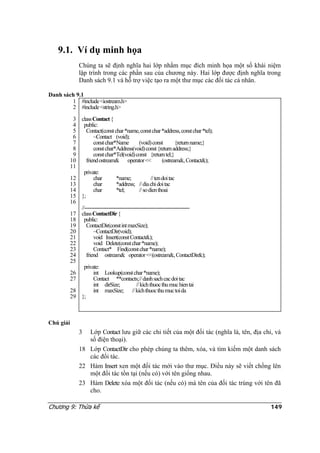 Chương 9 giải thích về thừa kế trong lập trình hướng đối tượng, cho phép các lớp con thừa hưởng thuộc tính từ các lớp cha mà không cần định nghĩa lại hoàn toàn. Điều này làm giảm việc sao chép mã và giúp cải thiện khả năng bảo trì. Ví dụ, lớp 'smartdir' được định nghĩa như là một lớp dẫn xuất từ 'contactdir', có thể theo dõi đối tác được tìm kiếm gần nhất.