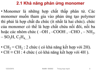 Chương 2 trình bày về quá trình trùng hợp mạch, bao gồm khả năng phản ứng của monomer, điều kiện phản ứng, cũng như các loại phản ứng trùng hợp như gốc và ion. Nó cũng đề cập đến các phương pháp trùng hợp như trùng hợp khối, dung dịch, nhũ tương và huyền phù, cùng với khái niệm đồng trùng hợp. Cuối cùng, chương khám phá vai trò của các yếu tố như nhiệt độ, áp suất và chất khơi mào trong quá trình tổng hợp polymer.