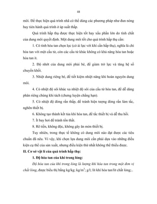 Tài liệu mô tả quá trình hấp thụ khí trong công nghiệp hóa chất, nhấn mạnh tầm quan trọng của việc tách các cấu tử khí để phục vụ cho các quy trình sản xuất. Có ba phương pháp tách hỗn hợp khí: hóa lí, hóa học và hút, trong đó quá trình hấp thụ bằng chất lỏng là phổ biến nhất. Sự chọn lựa dung môi thích hợp rất quan trọng cho hiệu suất hấp thụ, cũng như cân nhắc các yếu tố nhiệt độ và áp suất ảnh hưởng đến quá trình này.