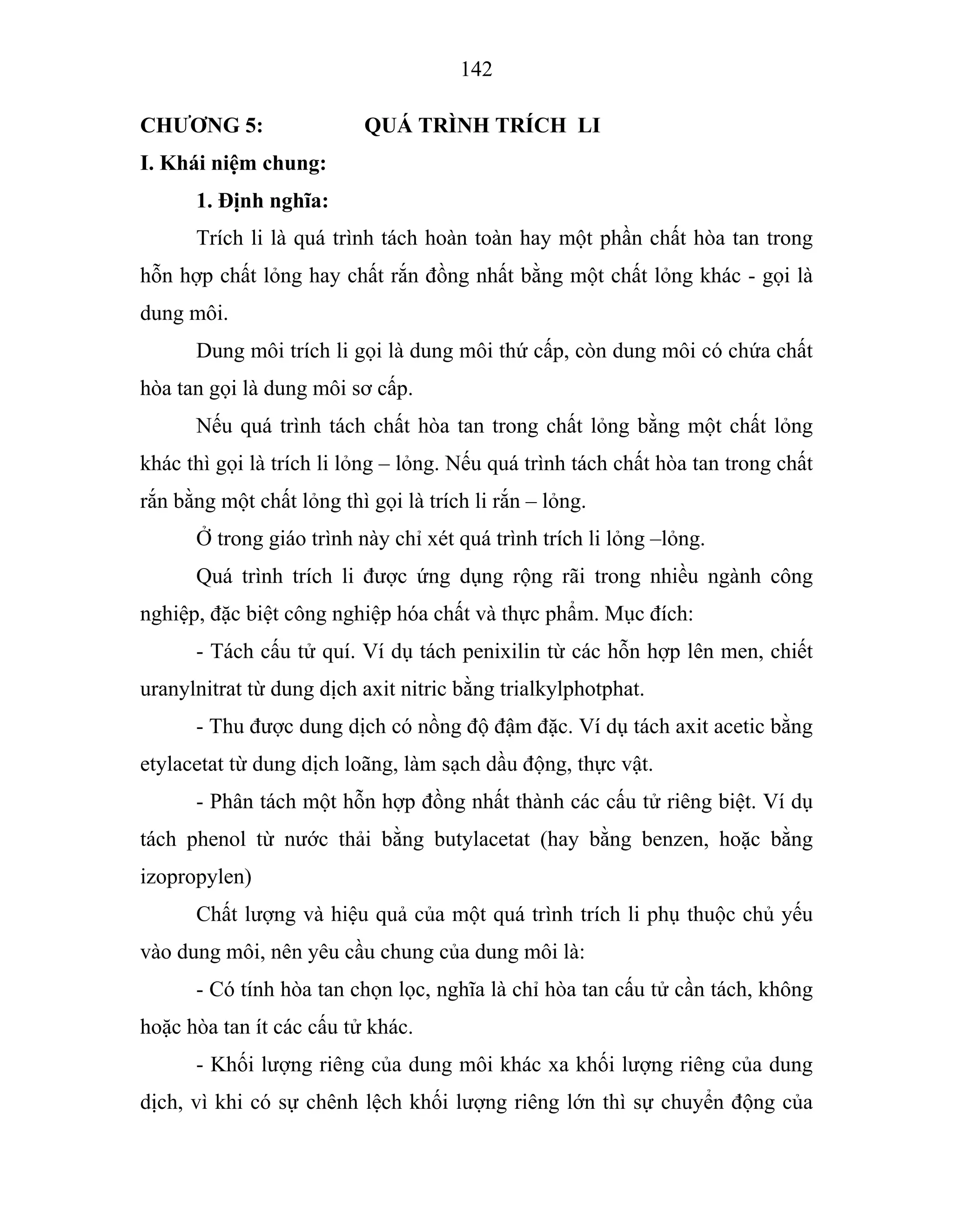 Quá trình trích li là phương pháp tách các chất hòa tan từ hỗn hợp lỏng bằng dung môi thứ cấp, thường được áp dụng trong ngành công nghiệp hóa học và thực phẩm. Tài liệu mô tả quá trình trích li lỏng-lỏng, bao gồm ba giai đoạn chính: trộn lẫn, tách pha và hoàn nguyên dung môi, cũng như các yêu cầu về dung môi sử dụng để đạt hiệu quả cao. Ngoài ra, tài liệu cũng đề cập đến cân bằng pha, định luật phân bố và ảnh hưởng của nhiệt độ đến quá trình trích li.