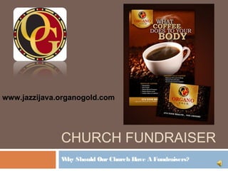 This document discusses a coffee fundraiser for churches organized by Organo Gold. It notes that churches are looking for outside fundraising sources as members have less money to donate. A coffee fundraiser is proposed as it has high profit margins of 50-1000% and coffee is one of the most widely consumed beverages. The fundraiser would involve churches promoting and selling a variety of Organo Gold coffee, tea and hot chocolate products to raise money. Churches can contact the consultant Gwendolyn Harris to get started.