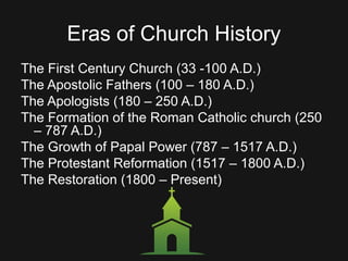 This document provides an overview of church history from the 1st century AD to the present. It summarizes the writings of the Apostolic Fathers from 100-180 AD, which show that church practices had changed little from the New Testament model. The document also outlines the persecutions faced by the early church from Roman emperors from Nero in 54 AD to Diocletian in the early 4th century AD. It notes that after Constantine issued the Edict of Milan in 313 AD granting religious freedom to Christians, unscriptural changes began to emerge in church practices and governance.