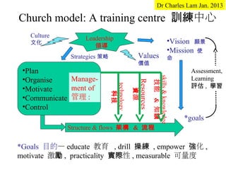 该文档讨论了一个训练中心的教会模型,强调领导力、愿景、使命和价值观。它概述了评估和管理技能与知识的策略,以及组织学习资源和利用科技的方式。最终目标是教育、操练、增强动力和确保结果的可测量性。