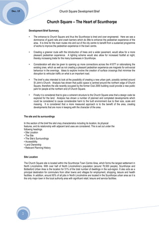 This document provides a development brief for improving the Church Square area in Scunthorpe, England. It notes that the current entrance to Church Square is tired and uninviting for pedestrians. The brief proposes creating a greener route with trees, wider pavements, and lighting to improve the pedestrian experience and encourage more foot traffic. It also suggests opening up more connections across a major road or rationalizing existing connections to improve safety. The brief examines transforming a vacant lot into an urban park centered around a historic church. Finally, it recommends establishing design guidelines to ensure new developments are in keeping with the character of the area and do not negatively impact the built environment.