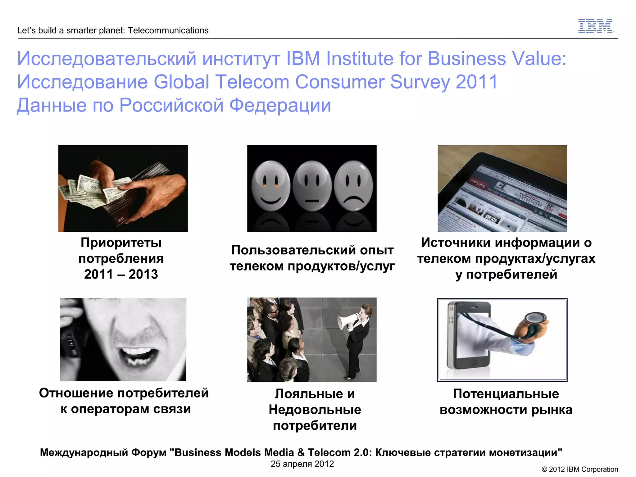 Документ представляет результаты глобального исследования потребителей телекоммуникационных услуг IBM в России, выявляя ключевые аспекты потребительского опыта, такие как доступность сети, прозрачность счетов и уровень лояльности клиентов. Операторы связи должны уделять больше внимания неудовлетворенным абонентам и внедрять инновации для повышения лояльности клиентов. Важным выводом является необходимость изменить подход к обслуживанию с акцентом на эмоциональные потребности потребителей.