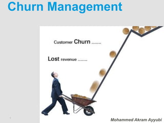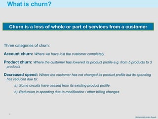 The document outlines the complexities of customer churn, categorizing it into account churn, product churn, and decreased spend. It emphasizes the need for effective churn management strategies within organizations to ensure revenue growth and customer retention. Key processes include defining churn reasons, reporting and analytics, predicting future churn events, and implementing proactive treatment campaigns.