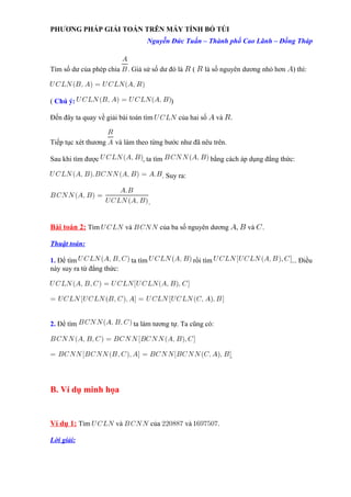 Tài liệu hướng dẫn phương pháp giải toán trên máy tính bỏ túi của Nguyễn Đức Tuấn tập trung vào việc tìm ước chung lớn nhất (UCLN) và bội chung nhỏ nhất (BCNN) của các số nguyên dương. Qua các ví dụ minh họa và thuật toán giải, người học được hướng dẫn cách thực hiện phép chia và xử lý kết quả để tìm UCLN và BCNN. Cuối cùng, tài liệu cũng cung cấp bài tập vận dụng để học sinh có thể thực hành những kiến thức đã học.