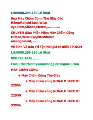 Cung cấp dịch vụ sửa chữa, vệ sinh và bảo trì máy chấm công, máy đếm tiền và máy văn phòng khác tại TP.HCM. Các thiết bị bao gồm nhiều dòng máy chấm công từ các hãng khác nhau. Ngoài ra, còn cung cấp phần mềm chấm công và các loại thẻ nhân viên, thẻ cảm ứng.