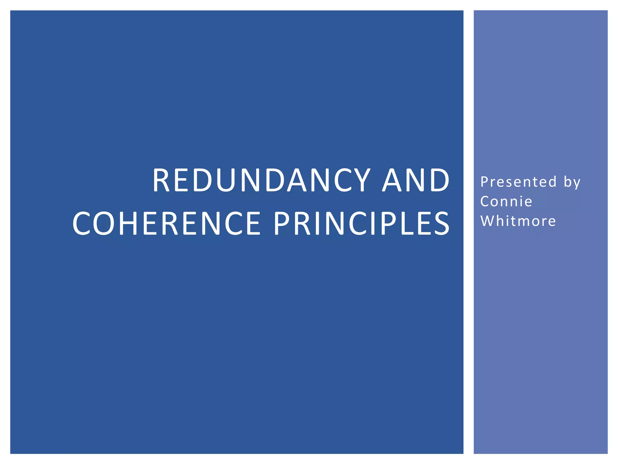 This document discusses the redundancy and coherence principles for effective multimedia learning. The redundancy principle states that graphics should be explained with words either in audio or text format, but not both, as it can overload the visual channel. The coherence principle suggests avoiding adding extraneous materials like interesting but irrelevant audio, graphics, or words, as they can distract from the core content and hurt learning. Both principles aim to reduce cognitive overload and focus learners on the essential information.