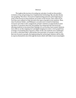 The unit plan focused on graphing and implemented various technologies throughout the lessons, including podcasts to introduce topics, YouTube videos to explain graph types, and social media accounts for students to discuss assignments. Students conducted surveys, used digital tools to create graphs from images, and were challenged to build robots related to graphs. By incorporating these technologies, the lessons allowed students more ways to engage with and understand the topics.