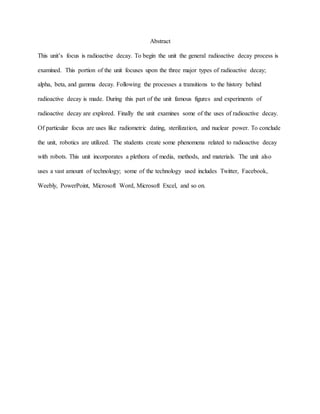 This unit focuses on radioactive decay, examining the three main types of decay - alpha, beta, and gamma. It explores the history of discoveries in radioactive decay through famous figures and experiments. The unit also looks at applications of radioactive decay such as radiometric dating, sterilization, and nuclear power. Students conclude the unit by creating robotic models of radioactive decay phenomena.