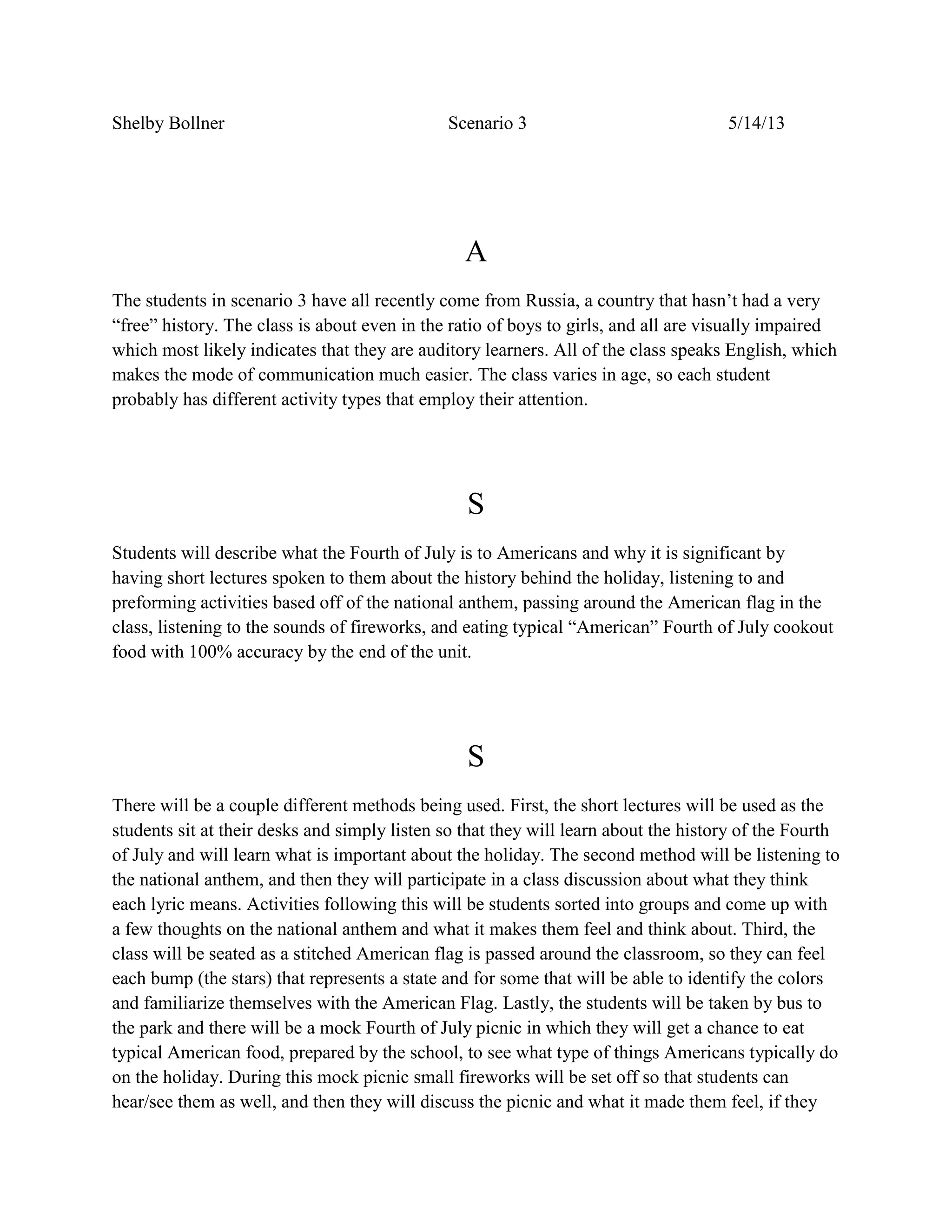 The document outlines a lesson plan for visually impaired students from Russia to learn about the Fourth of July through various auditory and tactile activities. Students will engage in lectures, discussions, and a mock picnic featuring American food and fireworks sounds, aimed at helping them understand the significance of the holiday. The teacher will evaluate student enjoyment and retention of knowledge to improve future lesson effectiveness.