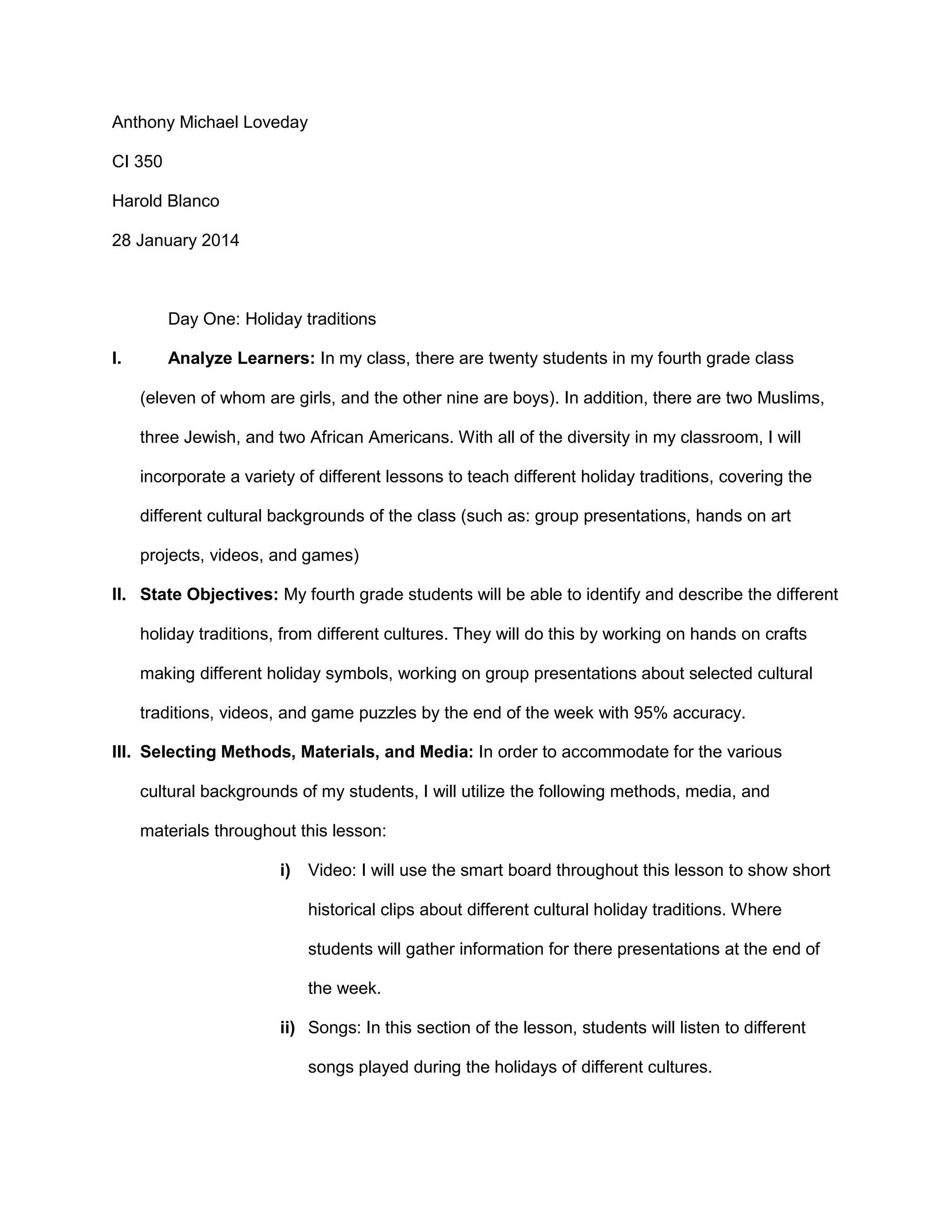 This document outlines a lesson plan for a 4th grade classroom on holiday traditions from different cultures. The plan includes analyzing the diverse class of 20 students, stating the objectives of identifying and describing various cultural holiday traditions through activities. Methods like videos, songs, group projects, and hands-on art are selected to accommodate different backgrounds. Materials like art supplies, the smart board, and chairs/tables will be prepared. The first day will introduce Jewish traditions through a video and songs, followed by hands-on art to create symbols for presentations later in the week. Student comprehension will be assessed through discussion, checking understanding, monitoring group work, asking about differences, and a final presentation.