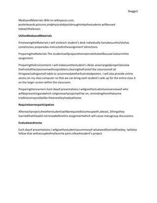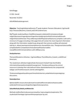 This document outlines a lesson plan for teaching 4th grade students about holiday traditions. The objective is for students to research and present projects on the Christmas traditions of a religion other than their own. There are 20 students from various religious backgrounds. The teacher will use class time to help students complete their research and wikis. Students will fill a poster with pictures, write a 4+ page wiki, and bring in two example items to share with the class about the traditions of their assigned religion. After each presentation, other students will share two things they learned to encourage discussion. Each day the teacher will summarize what was learned and provide feedback.