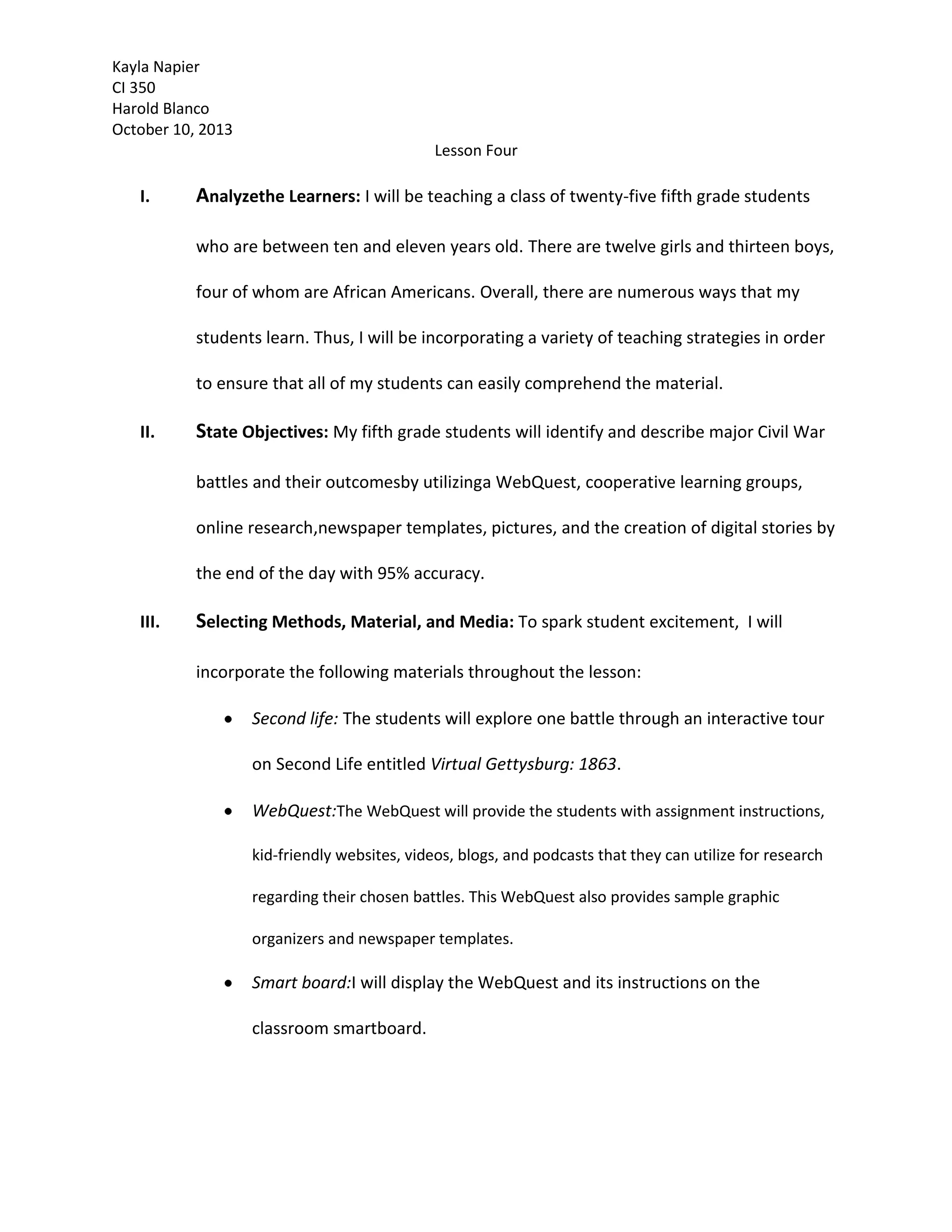 This document outlines a lesson plan for teaching fifth grade students about major Civil War battles. The teacher will use a variety of methods including a Second Life virtual tour of Gettysburg, online research through a WebQuest, and creating digital stories and newspaper articles in groups. Students will research two battles, taking notes on graphic organizers, then write a newspaper article and create a digital story to depict the "breaking news" of each battle. The teacher will evaluate students by checking their work and participation in groups, collecting assignments, and grading the digital stories based on a rubric.