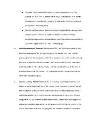 This document outlines a lesson plan for teaching first grade special education students the months of the year. It will utilize various methods, materials and media including songs, interactive smartboard activities, podcasts, QR codes, role-playing and calendars. The objectives are for students to recite the months in order with 95% accuracy by the end of the week. Evaluation will include checking participation, asking questions about month order, having students match months to characteristics, and reciting the months.